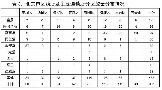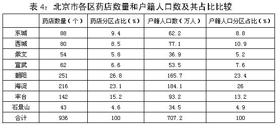 根據(jù)有關(guān)政府部門的統(tǒng)計(jì)資料,結(jié)合本次調(diào)查在各區(qū)的資料收集和核實(shí),確定北京市市區(qū)共有藥店936家。