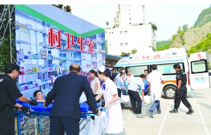 笛聲急促,閃爍著救護(hù)燈的兩輛救護(hù)車(chē)駛?cè)氪逍l(wèi)生室,醫(yī)務(wù)工作者提著出診箱、抬著擔(dān)架走進(jìn)事故現(xiàn)場(chǎng)。