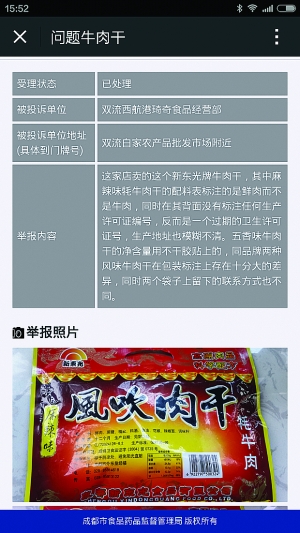 7月15日,成都市食品藥品監(jiān)管局微信平臺收到一則投訴信息,舉報雙流縣西航港某食品經營部銷售的牦牛肉標簽有問題。成都市12331投訴舉報中心接到舉報后,馬上把信息通報給雙流縣食品藥品監(jiān)管局。當日下午,雙流縣局即安排西航港街道食品藥品監(jiān)管所的執(zhí)法人員到現場檢查,發(fā)現該經營部已經沒有被舉報的產品,無從取證。但是發(fā)現了食品生產許可證號碼存在問題的新東光食品廠生產的牛肉干和部分植物蛋白食品,共4種,5個批次。此前,成都市局稽查總隊已在新東光食品廠調查,該廠稱未生產過以上產品。針對這種情況,執(zhí)法人員對可能存在問題的食品進行了查封扣押,并作進一步調查。7月16日上午,舉報人就在微信平臺收到了反饋信息。