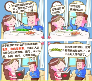 四季豆中含有兩種毒素,分別為皂素和血球凝集素。皂素對(duì)人體胃腸道具有強(qiáng)烈的刺激性,可引起出血性炎癥,并對(duì)紅細(xì)胞有溶解作用。血球凝集素具有紅細(xì)胞凝集作用。攝入未煮熟的四季豆,引起中毒的潛伏期為數(shù)十分鐘,一般不超過5個(gè)小時(shí),主要表現(xiàn)為惡心、嘔吐、腹痛和腹瀉等胃腸炎癥狀,另有頭暈、頭痛、胸悶、出冷汗以及心慌等表現(xiàn)。
