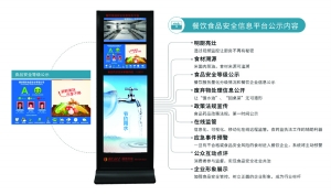 這塊顯示屏是全稱為“餐飲食品安全信息發(fā)布平臺(tái)”的終端顯示設(shè)備。今年年初,成都市結(jié)合餐飲企業(yè)的“明廚亮灶”工程,在全市大中型餐飲企業(yè)和學(xué)校食堂推廣設(shè)立了“餐飲食品安全信息發(fā)布平臺(tái)”。該平臺(tái)是一套協(xié)助監(jiān)管部門對餐飲企業(yè)實(shí)施在線監(jiān)管、食品安全信息公示、信息發(fā)布的線上、線下相結(jié)合的多媒體互動(dòng)平臺(tái)。