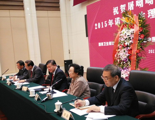 當(dāng)日,國家衛(wèi)生和計(jì)劃生育委員會(huì)、國家中醫(yī)藥管理局、國家食品藥品監(jiān)督管理總局共同舉辦座談會(huì),祝賀屠呦呦研究員榮獲2015年諾貝爾生理學(xué)或醫(yī)學(xué)獎(jiǎng)。