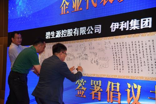 在本屆高峰論壇現(xiàn)場,50家食品生產(chǎn)經(jīng)營企業(yè)共同向全國從事食品生產(chǎn)經(jīng)營的單位和個人發(fā)出倡議:要知法守法、勇于擔責,加強自律、誠信崇德,精益求精、至善臻美,透明公開、接受監(jiān)督,有序競爭、追求共贏,共同開啟一個風清氣朗、蓬勃向上的大健康產(chǎn)業(yè)美好時代。圖為企業(yè)代表在倡議書上簽字并集體合影。 本報記者 鄧橋 攝