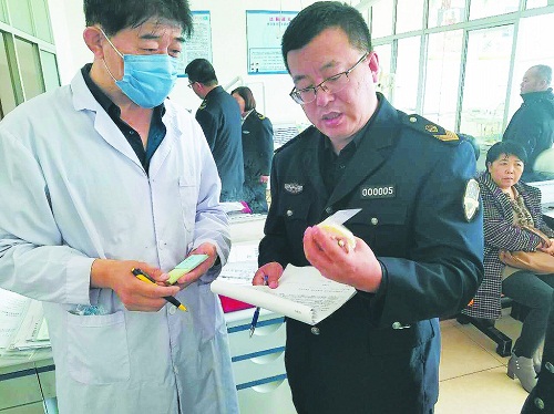圖為執(zhí)法人員在一家口腔診所檢查義齒購進(jìn)驗收記錄。 本報特約記者 楊燕 攝