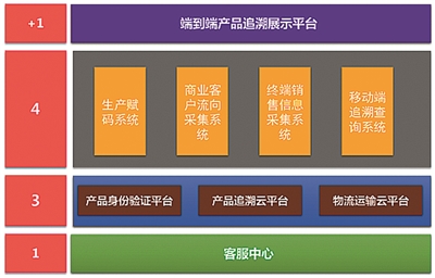 “1”是指建立1個(gè)客服中心,對(duì)外向商業(yè)客戶、消費(fèi)者提供產(chǎn)品質(zhì)量、用法、真?zhèn)涡畔⒉樵兒头答?,要為客服中心開(kāi)放必要的追溯系統(tǒng)查詢權(quán)限?!?”是指3個(gè)平臺(tái):第一個(gè)平臺(tái)是指存放追溯系統(tǒng)相關(guān)服務(wù)器、存儲(chǔ)資源的云平臺(tái),定位在IaaS層面;第二個(gè)平臺(tái)是指多個(gè)企業(yè)、多條生產(chǎn)線共用的產(chǎn)品身份驗(yàn)證平臺(tái),定位在SaaS層面;第三個(gè)平臺(tái)是指物流運(yùn)輸云平臺(tái),定位在SaaS層面?!?”是指要為上述4個(gè)關(guān)鍵節(jié)點(diǎn),按照追溯的設(shè)計(jì)原理,建立對(duì)應(yīng)的應(yīng)用系統(tǒng),包括生產(chǎn)賦碼系統(tǒng)、商業(yè)客戶流向采集系統(tǒng)、銷(xiāo)售終端信息采集系統(tǒng)、移動(dòng)端追溯查詢系統(tǒng)?!?1”是指將整個(gè)產(chǎn)品追溯系統(tǒng)中涉及的原料輔料包材供應(yīng)商、生產(chǎn)班次、產(chǎn)品規(guī)格、產(chǎn)品追溯碼、包裝追溯碼、商業(yè)產(chǎn)品流向等各類(lèi)信息,通過(guò)一個(gè)集成的平臺(tái)進(jìn)行匯集、展示和分析(在此我們命名為“端到端產(chǎn)品追溯展示平臺(tái)”),在出現(xiàn)產(chǎn)品質(zhì)量問(wèn)題時(shí),在這個(gè)平臺(tái)上通過(guò)輸入“產(chǎn)品追溯碼”或“包裝追溯碼”,就能以鏈條的方式對(duì)產(chǎn)品進(jìn)行銷(xiāo)售時(shí)間、銷(xiāo)售終端、商業(yè)客戶出入庫(kù)時(shí)間、物流承運(yùn)商、生產(chǎn)批號(hào)、原料輔料包材供應(yīng)商等信息進(jìn)行端到端的可視化追溯。