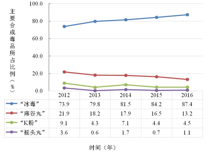 圖12 2012年—2016年主要合成毒品在合成毒品濫用人群中所占比例