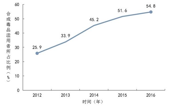 合成毒品濫用總體趨勢:合成毒品的報告濫用率為54.8%,同比2015年(51.6%)增長3.2個百分點。2012年(25.9%)至今,呈現(xiàn)逐年上升的趨勢,五年累計增加28.9個百分點。