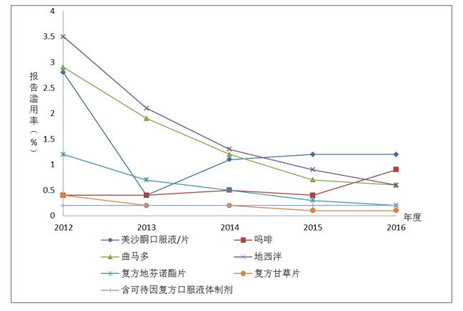 復方甘草片濫用/使用率為0.1%,與2015年(0.1%)相同;含可待因復方口服液體制劑濫用/使用率為0.3%,同比2015年(0.2%)有所升高。