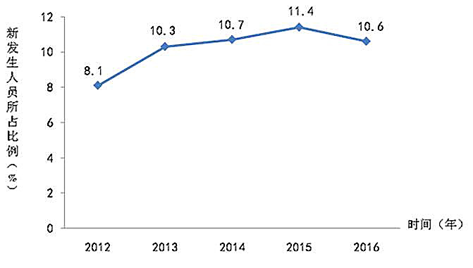 新發(fā)生人群占監(jiān)測報表總體的10.6%,與2012年相比增加2.5個百分點。在連續(xù)四年持續(xù)上升的情況下,2016年比2015年有所降低。
