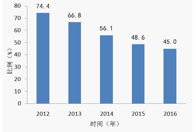 近5年來,海洛因濫用人群占全部濫用人群的比例呈逐年下降趨勢,由2012年的74.4%降至2016年的45.0%;