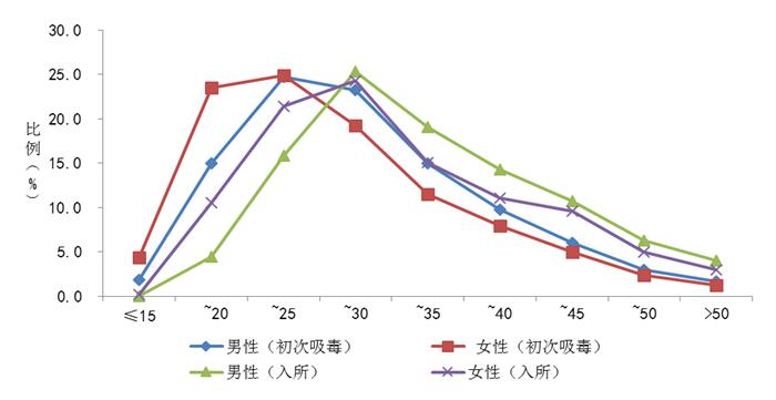 初始濫用年齡:合成毒品濫用人群初次平均藥物濫用年齡為28.3±8.6歲,男性為28.6±8.6歲,女性為26.6±8.7歲。其中35歲以下青少年遠高于整體藥物濫用人群,43.3%的合成毒品濫用者開始濫用毒品年齡小于25歲。