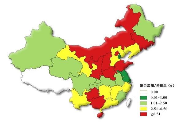 有14個省的醫(yī)療用藥品濫用/使用率大于全國平均濫用/使用率(4.0%)。內蒙古、陜西、海南3省/區(qū)的濫用/使用率大于10.0%,17個省的濫用/使用率小于4.0%,其中有10個省的報告濫用/使用率低于2.0%。