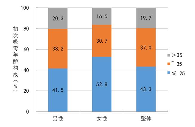 35歲以下青少年在合成毒品濫用人群的占比遠高于在整體藥物濫用人群中的占比,43.3%的合成毒品濫用者開始濫用毒品年齡小于25歲,合成毒品濫用人群年輕化,青少年是進行毒品危害健康宣傳教育的重點人群。女性合成毒品濫用者被查獲(或接受治療)時年齡和初次濫用年齡均較男性提前3~4歲,應重視對女性的禁毒宣傳和職業(yè)教育。