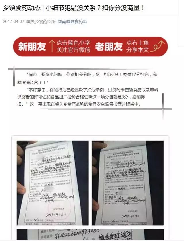 如加入熱點(diǎn)元素、超級話題,也就是“蹭熱點(diǎn)”。尤其在三線小城鎮(zhèn),當(dāng)?shù)氐臒衢T話題會引起更好的反響,在這個思路下,我們創(chuàng)作了《圍觀!不一樣的家長會!》、《驚!村民來到鎮(zhèn)食藥監(jiān)所辦事,嚇了一跳!》《逛吃,逛吃,吃的安心,廟會才能逛的開心!》等閱讀量和點(diǎn)贊量較高的推送。有時甚至從整篇文章中,只提煉一個亮點(diǎn),轉(zhuǎn)變整個文章的重心。如《小細(xì)節(jié)犯錯沒關(guān)系?扣你分沒商量!》把一篇紀(jì)實(shí)類的日常檢查報道稿,改成了針對食品記分管理工作進(jìn)行宣傳普及的推送。