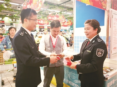 圖為近日深圳市局相關(guān)負責(zé)人在向食品經(jīng)營者贈送小冊子/攝影報道 陳海榮 鄒凡