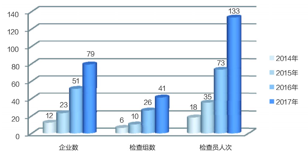 2014年~2017年,國家食藥監(jiān)總局飛行檢查的企業(yè)數(shù)、檢查組數(shù)和檢查員人次數(shù)增長明顯。其中,檢查企業(yè)數(shù)從2014年的12家,增長到2017年的79家;檢查員人次數(shù)從2014年的18人次,增加到2017年的133人次。