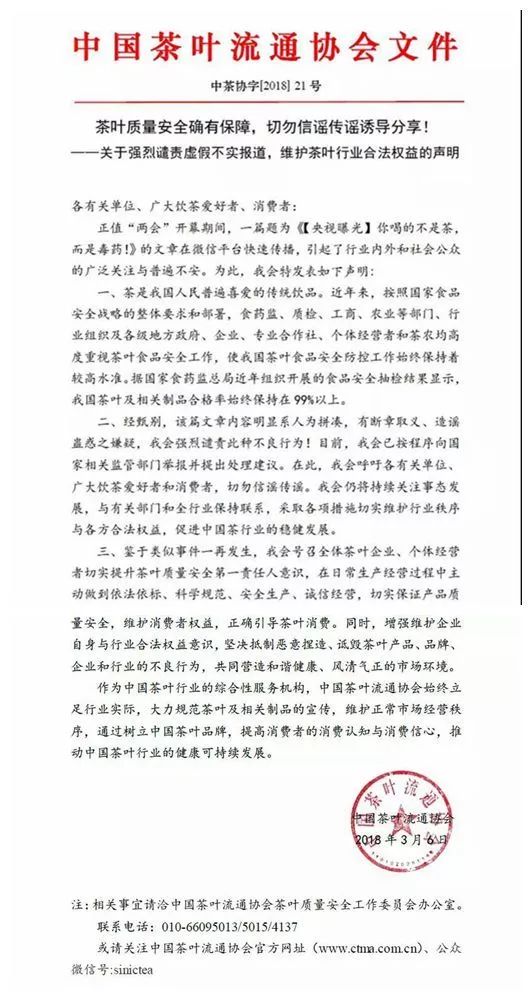 附:中國茶葉流通協(xié)會關(guān)于強烈譴責(zé)虛假不實報道的聲明
