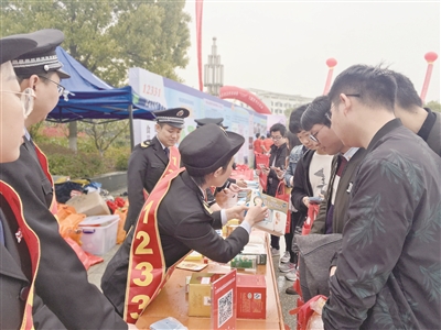 “12331——助力健康中國夢,食藥安全伴你行”主題宣傳活動中,江西省食品藥品監(jiān)管局工作人員在江西農(nóng)業(yè)大學向?qū)W生們介紹辨別真假保健食品的方法。 本報記者 譚彩丹 攝