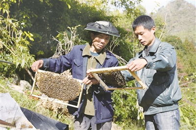 廣西壯族自治區(qū)食品藥品監(jiān)管局駐老圩場村“第一書記”李海舜(右)與貧困戶一起探索養(yǎng)蜂技術/攝影 李舒雯