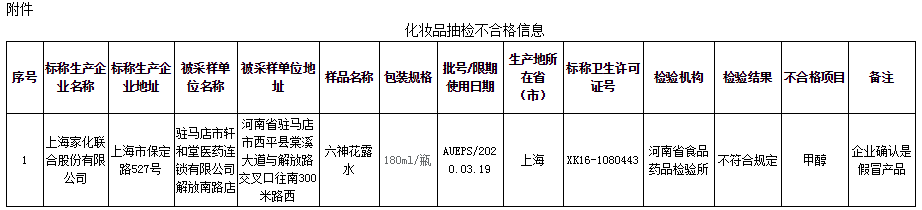 河南公布化妝品抽檢結(jié)果,涉及1批次六神花露水