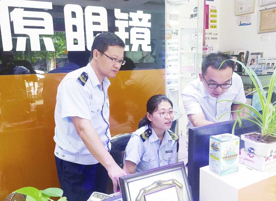 圖為檢查人員正在調取濟南市長清區(qū)中原眼鏡店經(jīng)營的隱形眼鏡的相關記錄。邵緒強 攝
