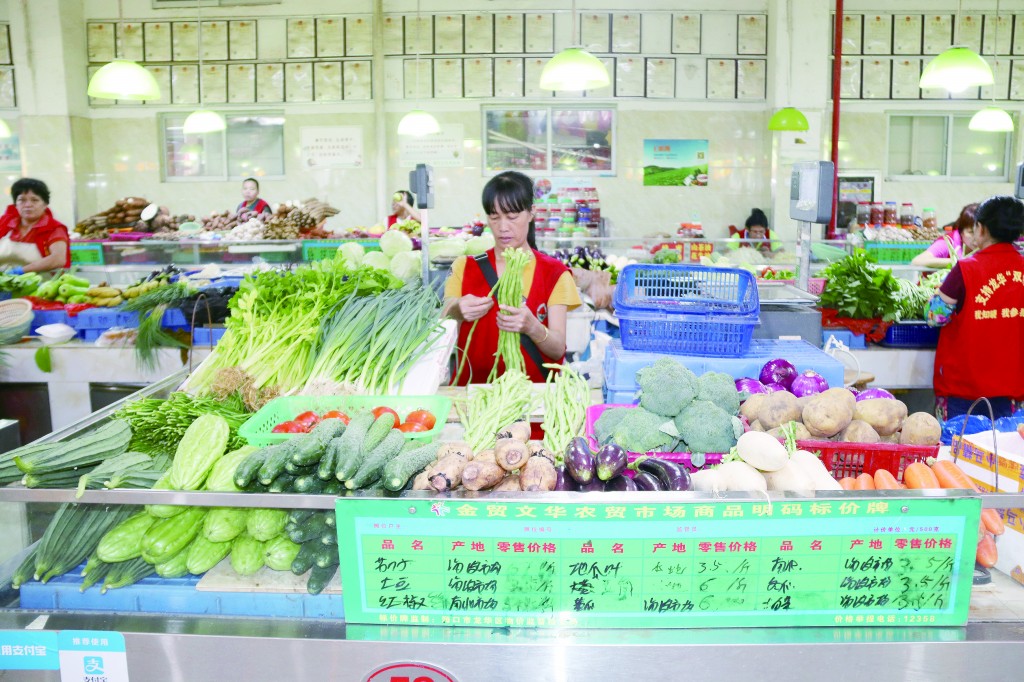 2015年年底,海口市通過政府補(bǔ)貼、企業(yè)參與的方式,由表及里對全市42家農(nóng)貿(mào)市場進(jìn)行升級改造。文華市場主動在原有高起點(diǎn)的基礎(chǔ)上,根據(jù)《??谑修r(nóng)貿(mào)市場設(shè)計導(dǎo)則》,投入968萬元改造升級,增加了食品安全監(jiān)管設(shè)施,還引入各種新的科技手段,將該市場建設(shè)成為“智慧農(nóng)貿(mào)市場”。比如:市場免費(fèi)給攤主配備了“智能秤”,可以提供準(zhǔn)確稱量計算、打印追溯憑證、電子支付結(jié)算等智能化服務(wù)。市民將選好的菜放到秤上后,顯示屏馬上顯示金額,只要用手機(jī)掃一掃上面的二維碼,就可以用微信、支付寶、銀行卡等完成支付。