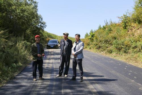 在剛剛修好的跨縣公路上,劉天一(右一)和村民展望達(dá)成村的發(fā)展前景。劉洋 攝