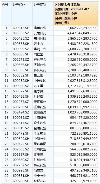 近10年累計(jì)分紅總額排名前30位的中藥類上市公司 來(lái)源:Wind數(shù)據(jù)