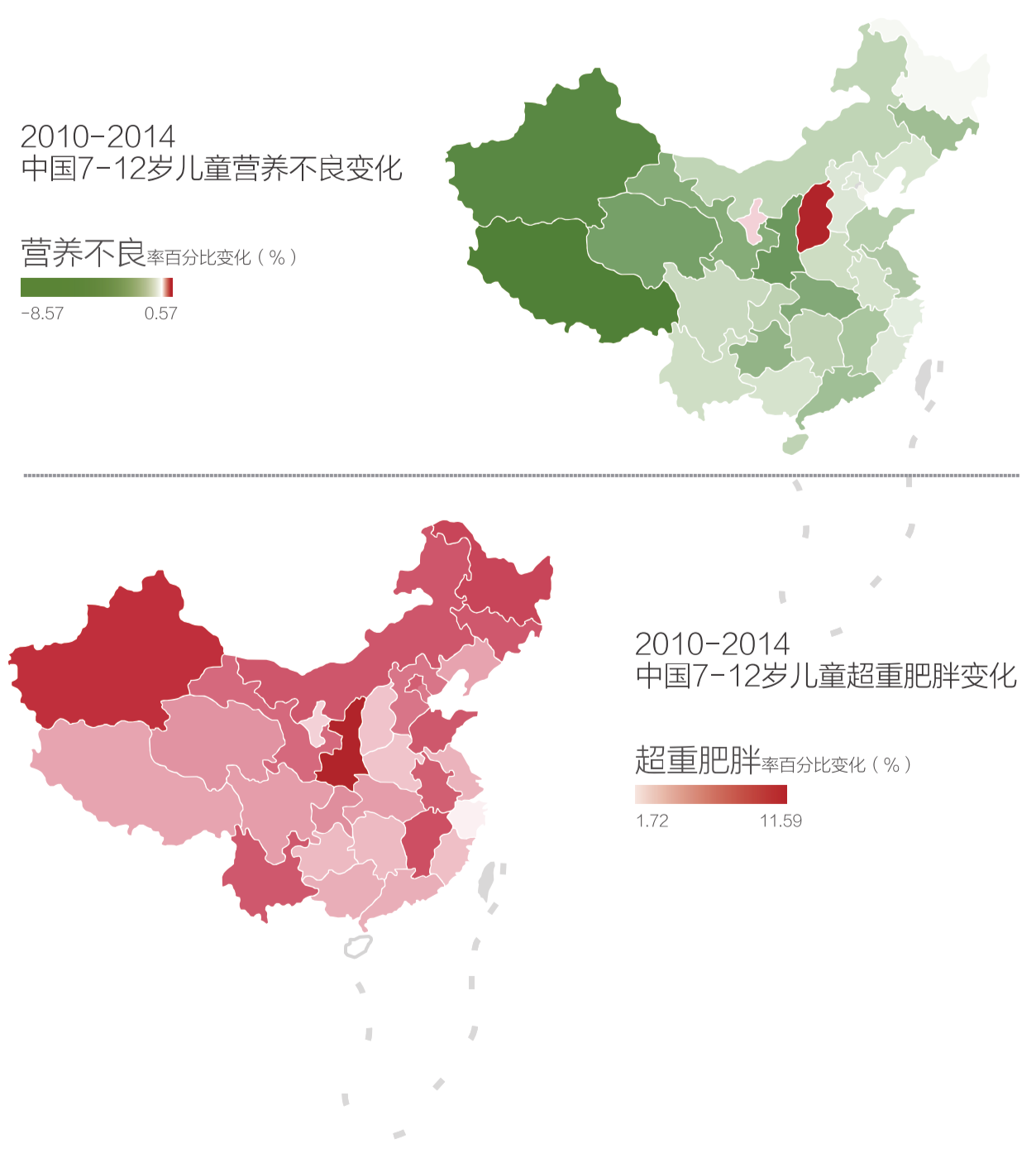 圖表說明:將2014年的各省營養(yǎng)不良率或超重肥胖率減去2010年的各省營養(yǎng)不良率或超重肥胖率得出的差值繪制成地圖。