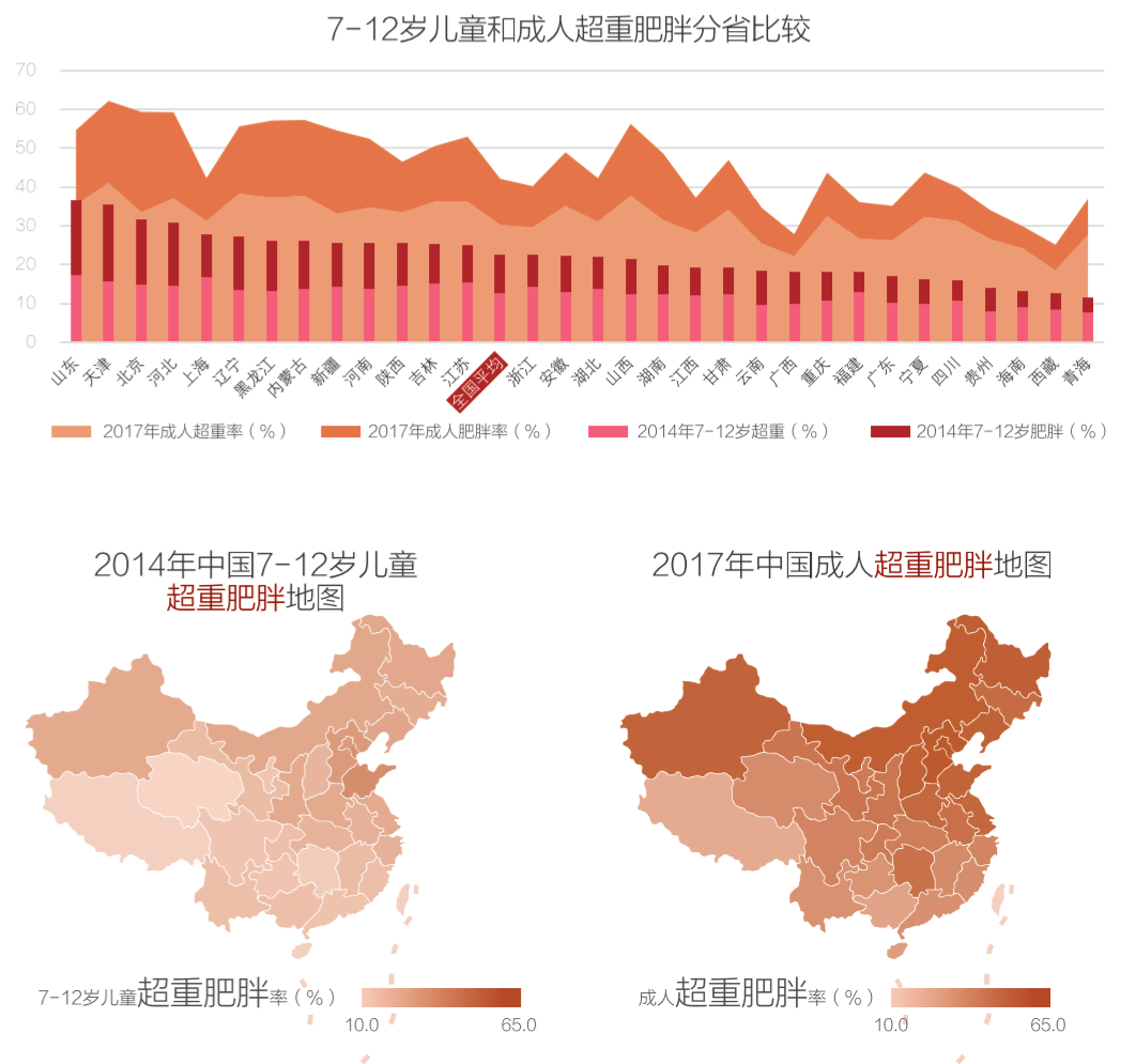 國家統(tǒng)計局和國家衛(wèi)計委的數(shù)據(jù)顯示,中國人的超重率和肥胖率均不斷上升。2014年7—12歲兒童和2017年成人超重肥胖率展現(xiàn)出較一致的分布特點,就整體區(qū)域性而言,超重肥胖率東部高于中、西部,北方高于南方。圖表說明:成人超重肥胖?jǐn)?shù)據(jù)來源于中國疾病預(yù)防控制中心于2017年發(fā)布的《慢性病及其危險因素檢測數(shù)據(jù)報告》。