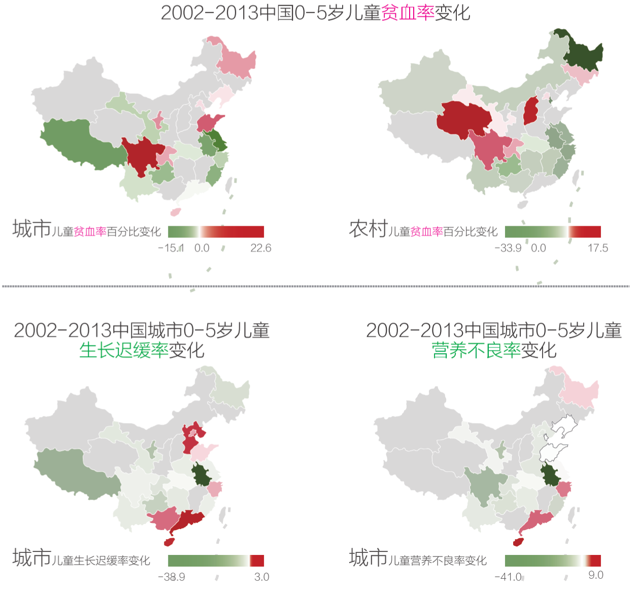 圖表說明:將2013年減去2002年的各省指標(biāo)檢出率得出的變化值繪成地圖,紅色深淺表示指標(biāo)檢出率上升的程度,綠色深淺表示指標(biāo)檢出率下降的程度。展示的地圖中有出現(xiàn)少數(shù)省份的檢出率上升,其余指標(biāo)所有省份均為下降。超重肥胖率從2002年到2013年各省均有增加,故未展示地圖。