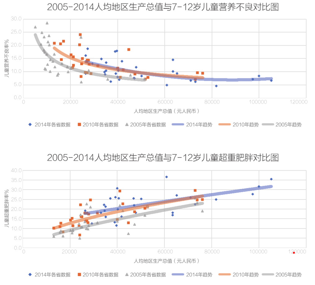 中國7—12歲兒童的超重肥胖率與地區(qū)經(jīng)濟(jì)發(fā)展成正比關(guān)系,主要集中在人均GDP較高的東部地區(qū),整體隨經(jīng)濟(jì)發(fā)展而上升;營養(yǎng)不良率與地區(qū)經(jīng)濟(jì)發(fā)展成反比關(guān)系,檢出主要集中在人均GDP較低的西南和西北地區(qū),整體隨經(jīng)濟(jì)發(fā)展而下降。