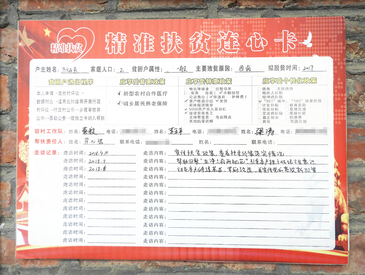 圖為萬(wàn)炳來(lái)家堂屋外墻顯眼處張貼的“精準(zhǔn)扶貧連心卡”。