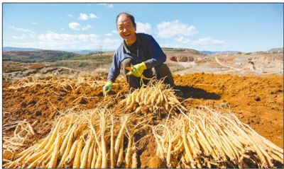 貴州省威寧彝族回族苗族自治縣“威寧黨參”是國(guó)家地理標(biāo)志產(chǎn)品。圖為該縣海拉鎮(zhèn)海昌村一名藥農(nóng)正在地里挖黨參。何歡 攝