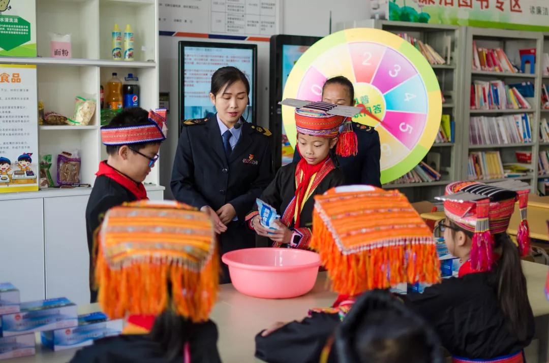 來(lái)賓市金秀瑤族自治縣市場(chǎng)監(jiān)督管理局開(kāi)展食品藥品安全科普宣傳活動(dòng),圖為少數(shù)名族學(xué)生科普宣傳講座上工作人員演示鹽水去除農(nóng)殘互動(dòng)環(huán)節(jié)。