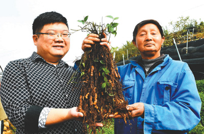 近日,浙江省杭州市余杭區(qū)三葉青中藥材現代農業(yè)園區(qū)員工在展示剛剛采摘的傳統(tǒng)中藥材三葉青。龍巍攝