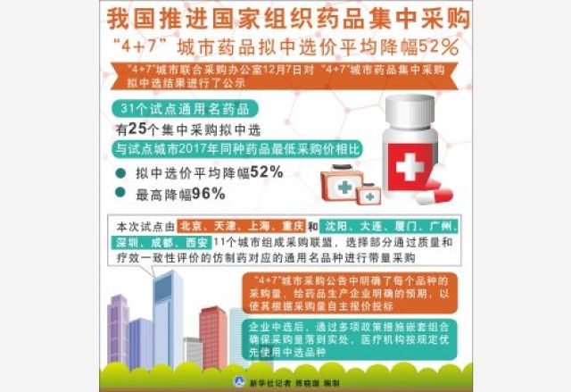 根據(jù)采購文件,北京、天津、上海、重慶和沈陽、大連、廈門、廣州、深圳、成都、西安11個城市(即4+7個城市)將進行國家組織藥品集中采購試點。試點地區(qū)委派代表組成聯(lián)合采購辦公室作為工作機構(gòu),代表試點地區(qū)公立醫(yī)療機構(gòu)實施集中采購。