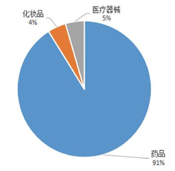 如圖8所示,2018年,藥品、化妝品、醫(yī)療器械的相關(guān)信息量較2016年、2017年均有較大幅度的增長(zhǎng),信息量由多到少依次為藥品、化妝品、醫(yī)療器械。其中2016年,受山東非法經(jīng)營(yíng)疫苗案、中藥材熏蒸等事件的影響,藥品數(shù)據(jù)量較大,占比達(dá)81.7%。2017年,整體較為平穩(wěn),藥品信息量有所減少,占比降至75.8%,化妝品、醫(yī)療器械信息量占比增加。2018年,受“長(zhǎng)春長(zhǎng)生違法違規(guī)生產(chǎn)狂犬病疫苗”事件、抗癌藥政策等重大事件的影響,藥品信息量增幅最大,藥品信息量增長(zhǎng)超過(guò)13倍;另外,醫(yī)療器械信息量增長(zhǎng)了5倍,化妝品信息量增長(zhǎng)了3.4倍。