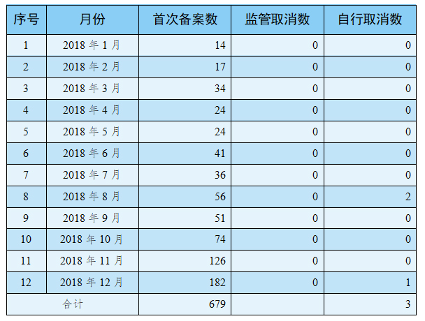 截止2018年12月31日,共有完成679次備案,其中機(jī)構(gòu)自行取消3次,所以676個(gè)機(jī)構(gòu)完成了醫(yī)療器械臨床試驗(yàn)機(jī)構(gòu)備案工作。自行取消備案的3個(gè)機(jī)構(gòu)為:四川大學(xué)華西醫(yī)院、沈陽愛爾眼視光醫(yī)院、合肥高新心血管病醫(yī)院,但這三個(gè)機(jī)構(gòu)又重新完成了備案。相關(guān)圖表如下: