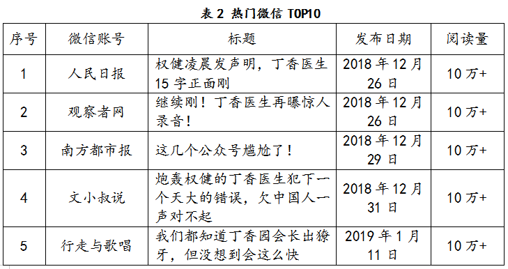 以2018年12月25日~2019年1月17日為監(jiān)測(cè)時(shí)間段,統(tǒng)計(jì)微信平臺(tái)相關(guān)文章的閱讀量,按文章閱讀量排序如表2所示。從熱門文章來(lái)看,丁香醫(yī)生的回應(yīng)以及對(duì)丁香醫(yī)生曝光權(quán)健的質(zhì)疑獲得關(guān)注度較高。