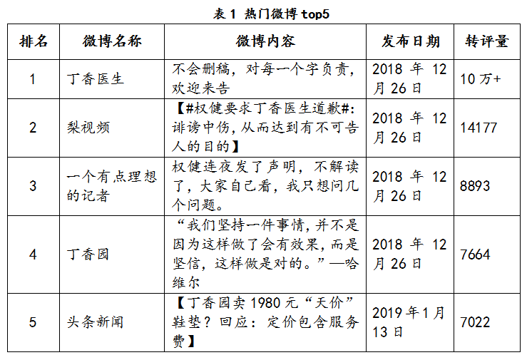 以2018年12月25日~2019年1月17日為監(jiān)測(cè)時(shí)間段,微博平臺(tái)上,丁香醫(yī)生、權(quán)健的聲明等成為主要關(guān)注點(diǎn)。按轉(zhuǎn)評(píng)量排序,熱門微博如表1所示。