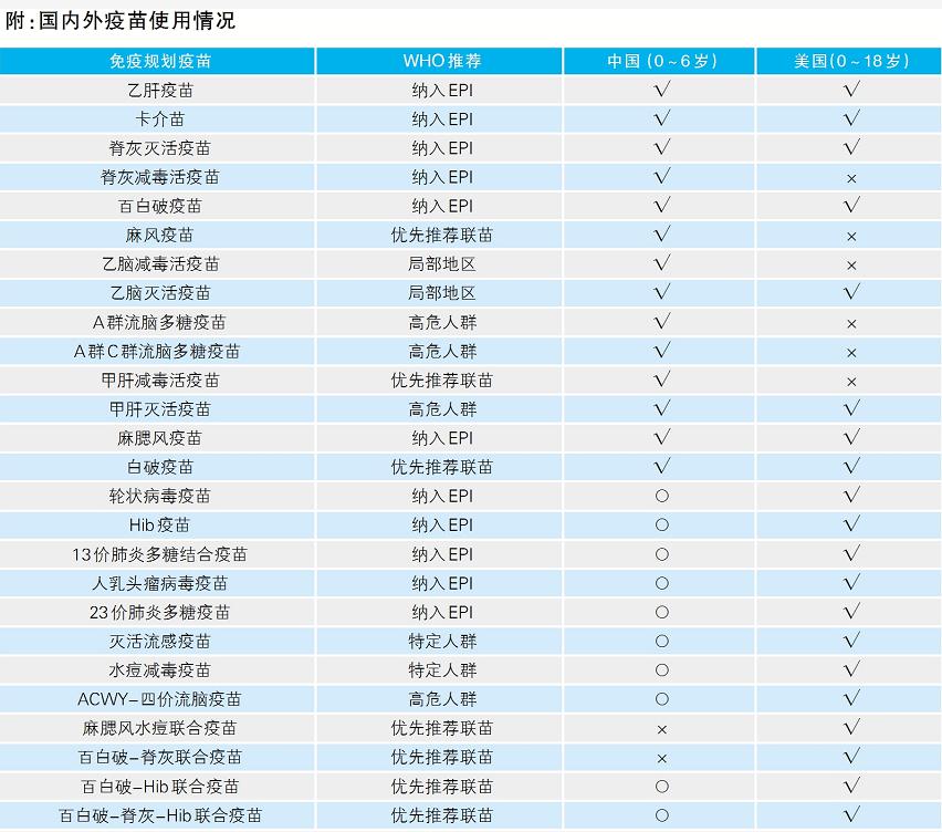 注:EPI(擴大免疫規(guī)劃);√:用于免疫規(guī)劃;×:未在本國內(nèi)使用;○:作為非免疫規(guī)劃類疫苗在中國境內(nèi)使用