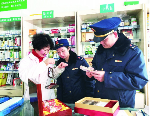 圖為執(zhí)法人員在藥店檢查人參稱重及外包裝標(biāo)簽情況。鄭攀 攝