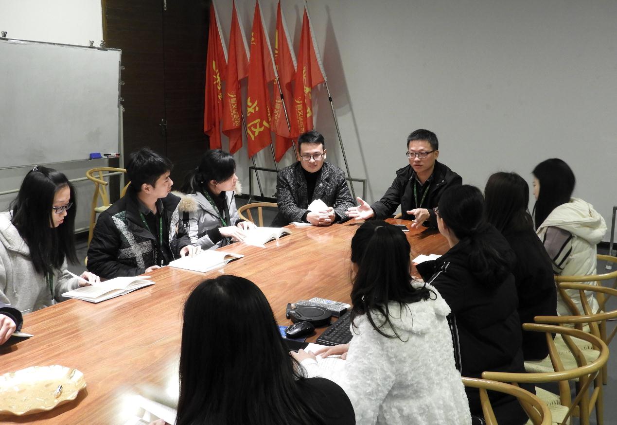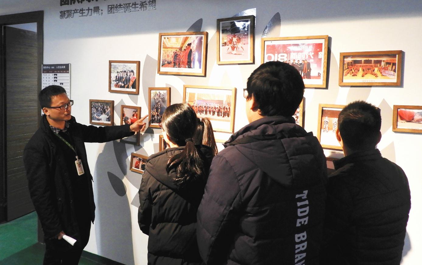 徐志剛(左一)向公司員工講解企業(yè)文化。