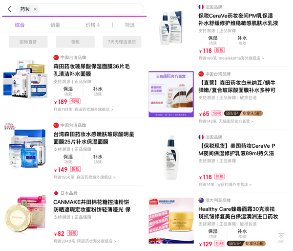 記者在天貓國際上搜索“藥妝”的結果