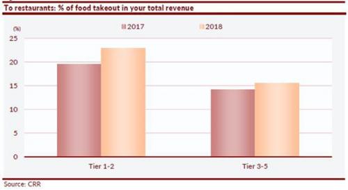 CRR在對80多家餐廳的訪問清楚地表明,餐廳老板認(rèn)為對于現(xiàn)在的餐廳而言,餐飲外賣業(yè)務(wù)是不可或缺的,餐飲外帶業(yè)務(wù)占餐廳總營收的比例正逐年提升。CRR數(shù)據(jù)表明,在一至二線城市,餐飲外帶業(yè)務(wù)占其餐廳總營收的比例從2017年的20%增至2018年的23%;在三至五線城市,這一比例從2017年的14%上升至2018年的16%。此外,人們使用餐飲外賣平臺進(jìn)行訂餐的比例也呈逐年遞增之勢。據(jù)CRR調(diào)查,2018年上半年,一至二線城市外賣用戶的比例高達(dá)80%,三至五線城市的比例為75%;而2015年上半年,對應(yīng)的比例分別僅為38%和29%。
