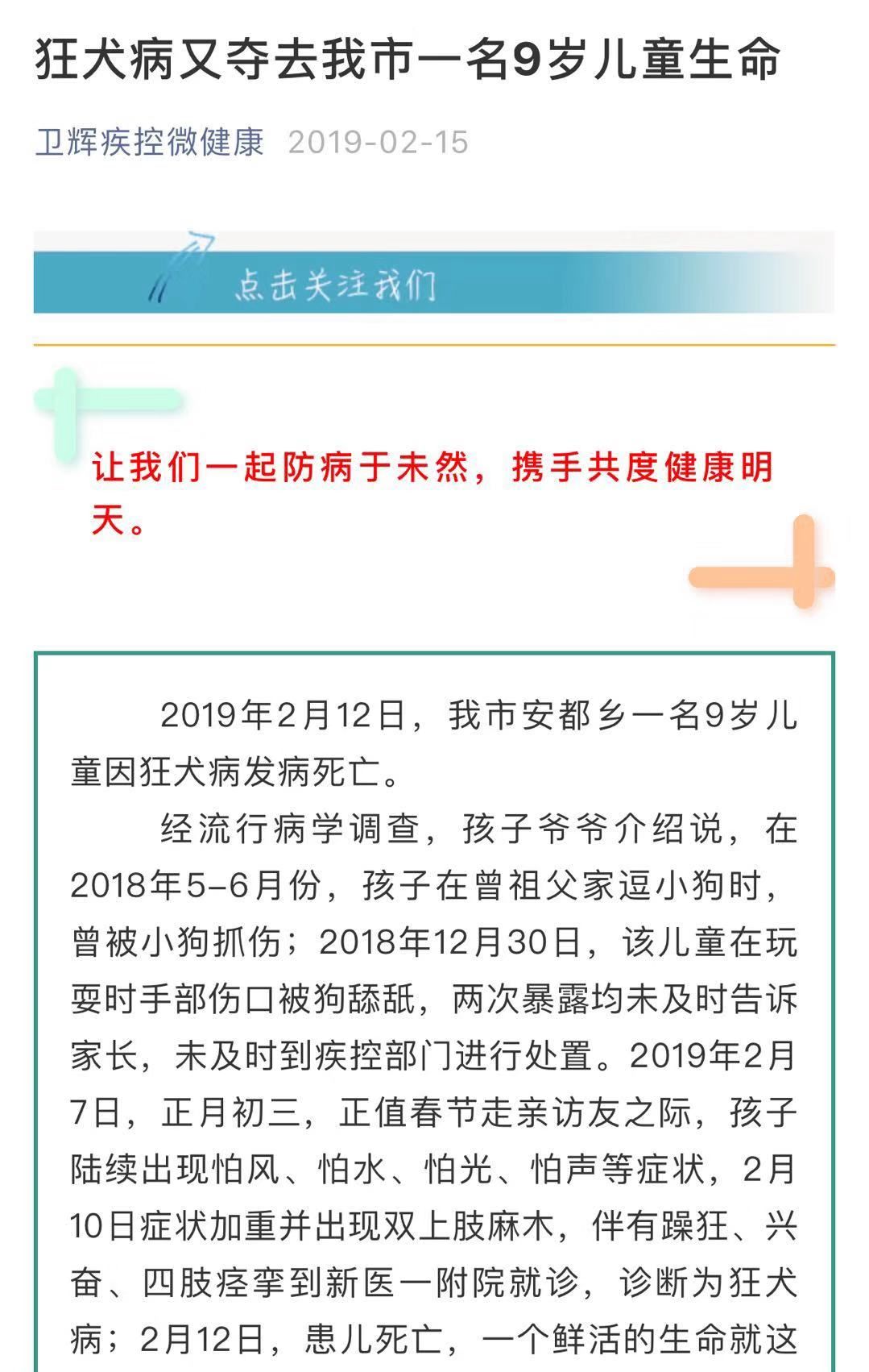 內(nèi)容顯示,在2018年5-6月份,男孩曾被小狗抓傷,2018年12月30日,該兒童在玩耍時(shí)手部傷口被狗舔舐,兩次暴露均未及時(shí)告訴家長,未及時(shí)到疾控部門進(jìn)行處置。2019年2月7日,孩子陸續(xù)出現(xiàn)怕風(fēng)、怕水、怕光、怕聲等癥狀,2月10日癥狀加重并出現(xiàn)雙上肢麻木,伴有躁狂、興奮、四肢痙攣到新醫(yī)一附院就診,診斷為狂犬病,2月12日,患兒死亡。