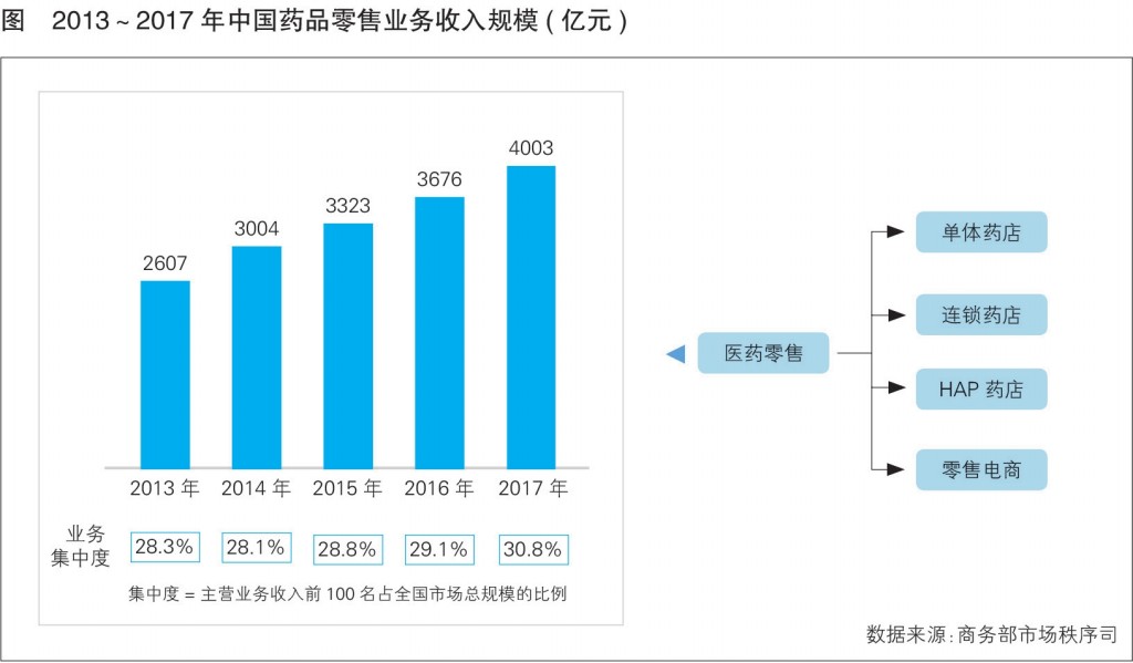 商務(wù)部發(fā)布的《2017年藥品流通行業(yè)運(yùn)行統(tǒng)計分析報告》顯示,2017年,我國藥品零售市場整體規(guī)模達(dá)4003億元,扣除不可比因素同比增長9%。預(yù)計到2020年,我國藥品零售市場整體規(guī)模有望達(dá)到5200億元。