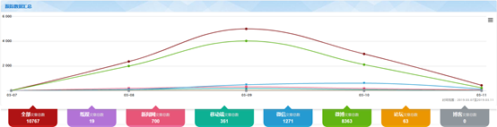 3月7日至11日12時,共監(jiān)測到相關(guān)信息10767篇次,其中,新聞網(wǎng)站700篇次,平面媒體19篇次,手機(jī)客戶端351篇次,微信1271篇次,微博8363篇次,論壇63篇次。人民網(wǎng)、人民日報客戶端、光明網(wǎng)、中國新聞網(wǎng)、環(huán)球網(wǎng)、新京報網(wǎng)等新聞媒體紛紛發(fā)布相關(guān)報道。