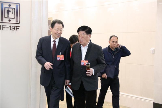 3月14日下午,十三屆全國(guó)人大二次會(huì)議舉行代表團(tuán)全體會(huì)議,審議政府工作報(bào)告、全國(guó)人大常委會(huì)工作報(bào)告等內(nèi)容。圖為全國(guó)人大代表、揚(yáng)子江藥業(yè)集團(tuán)董事長(zhǎng)徐鏡人(前右一)和全國(guó)人大常委會(huì)委員、全國(guó)人大教育科學(xué)文化衛(wèi)生委員會(huì)主任委員李學(xué)勇(前左一)在會(huì)議開始前進(jìn)行交流。(《中國(guó)醫(yī)藥報(bào)》記者落楠 攝)